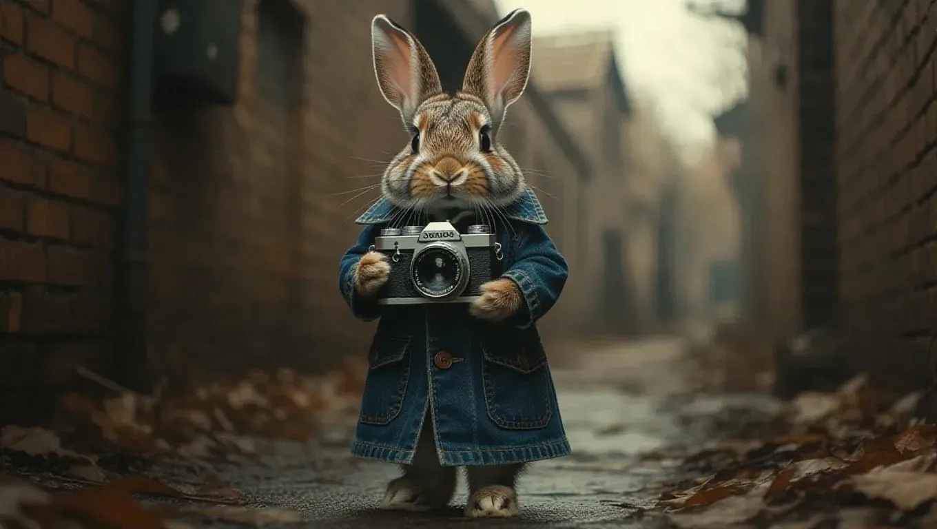 A captivating T 台 scene featuring a curious rabbit walking slowly in a patchwork trench coat with denim, holding a vintage camera, creating an artistic and nostalgic atmosphere.