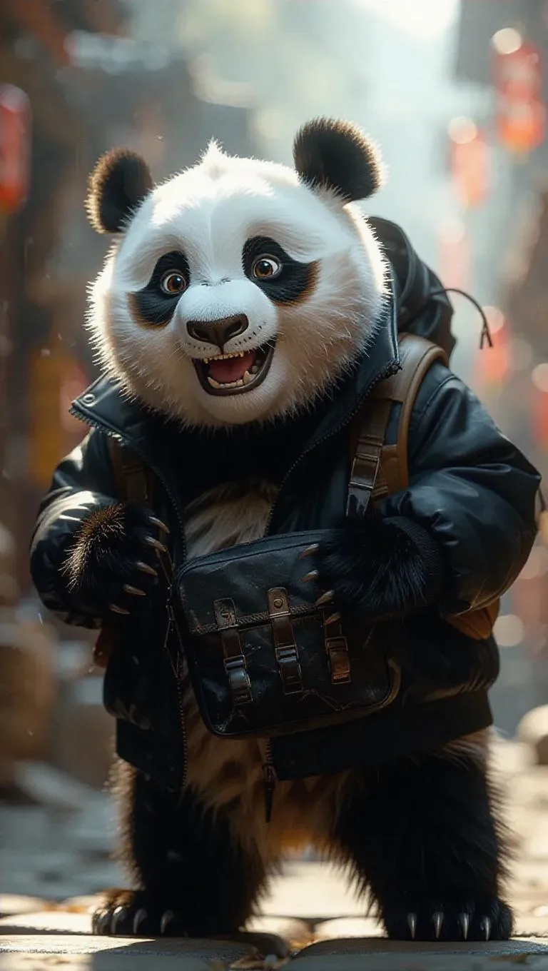 A cheerful T 台 scene featuring an adventurous panda exploring playfully in a sporty black jacket, wielding a playful sling bag, creating a dynamic and youthful atmosphere.