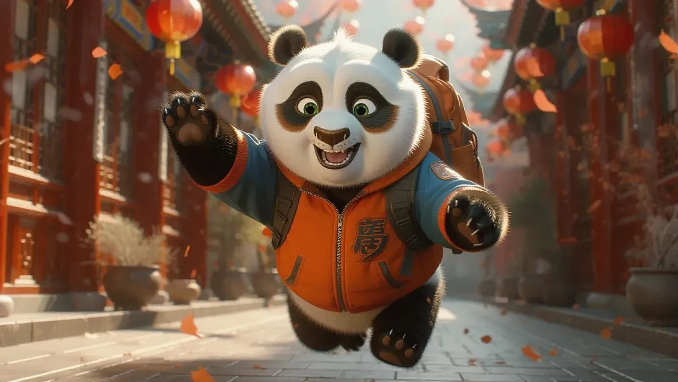 A cheerful T 台 scene featuring a spirited panda hopping playfully in a sporty jacket, carrying a stylish backpack, creating a fun and energetic atmosphere.