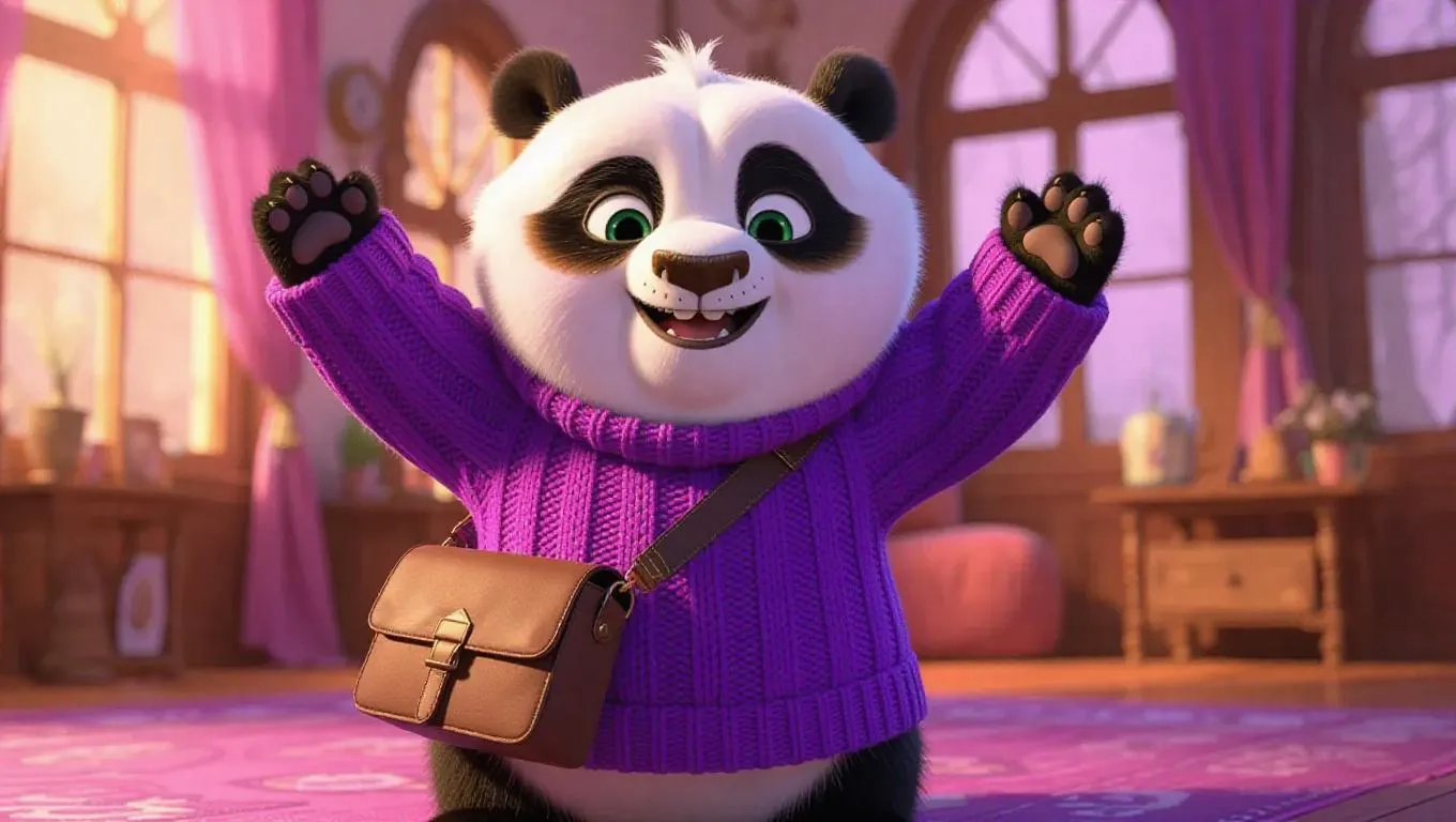 A cheerful T 台 scene featuring an adorable panda stretching happily in a cozy purple sweater, holding a trendy crossbody bag, creating a whimsical and stylish atmosphere.
