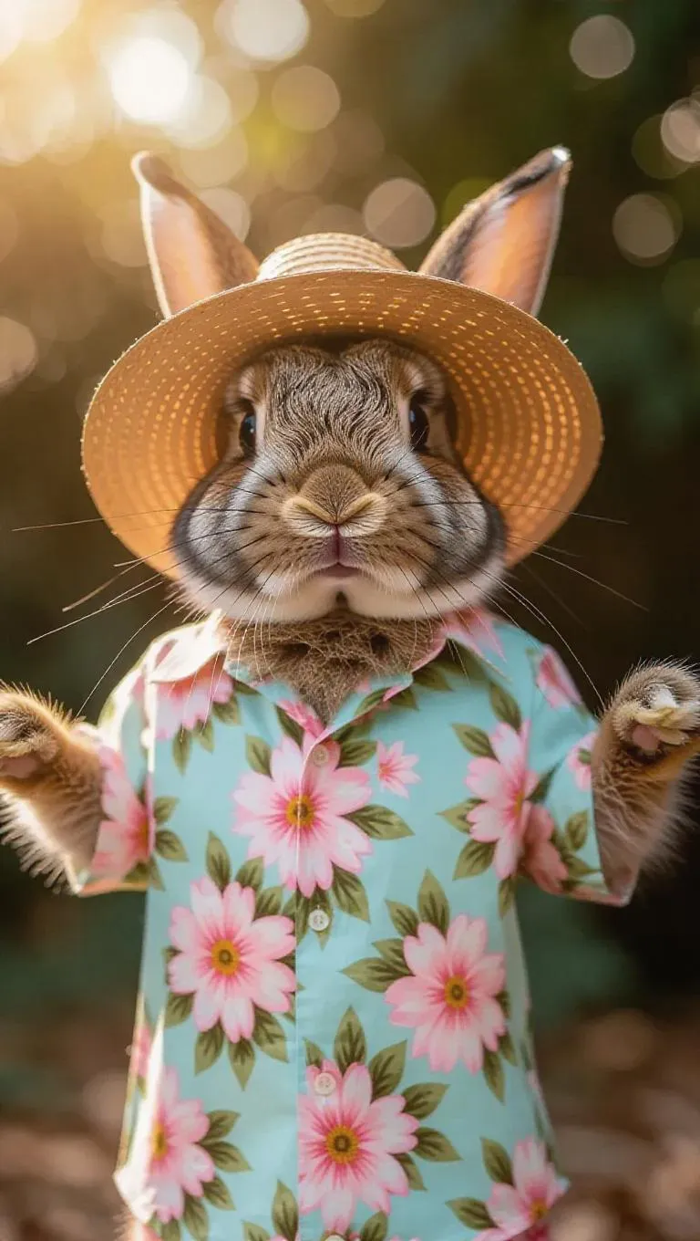 A cheerful T 台 scene featuring a charming rabbit strutting boldly in a floral shirt with pastel prints, wearing a sun hat, creating a sunny and cheerful atmosphere.