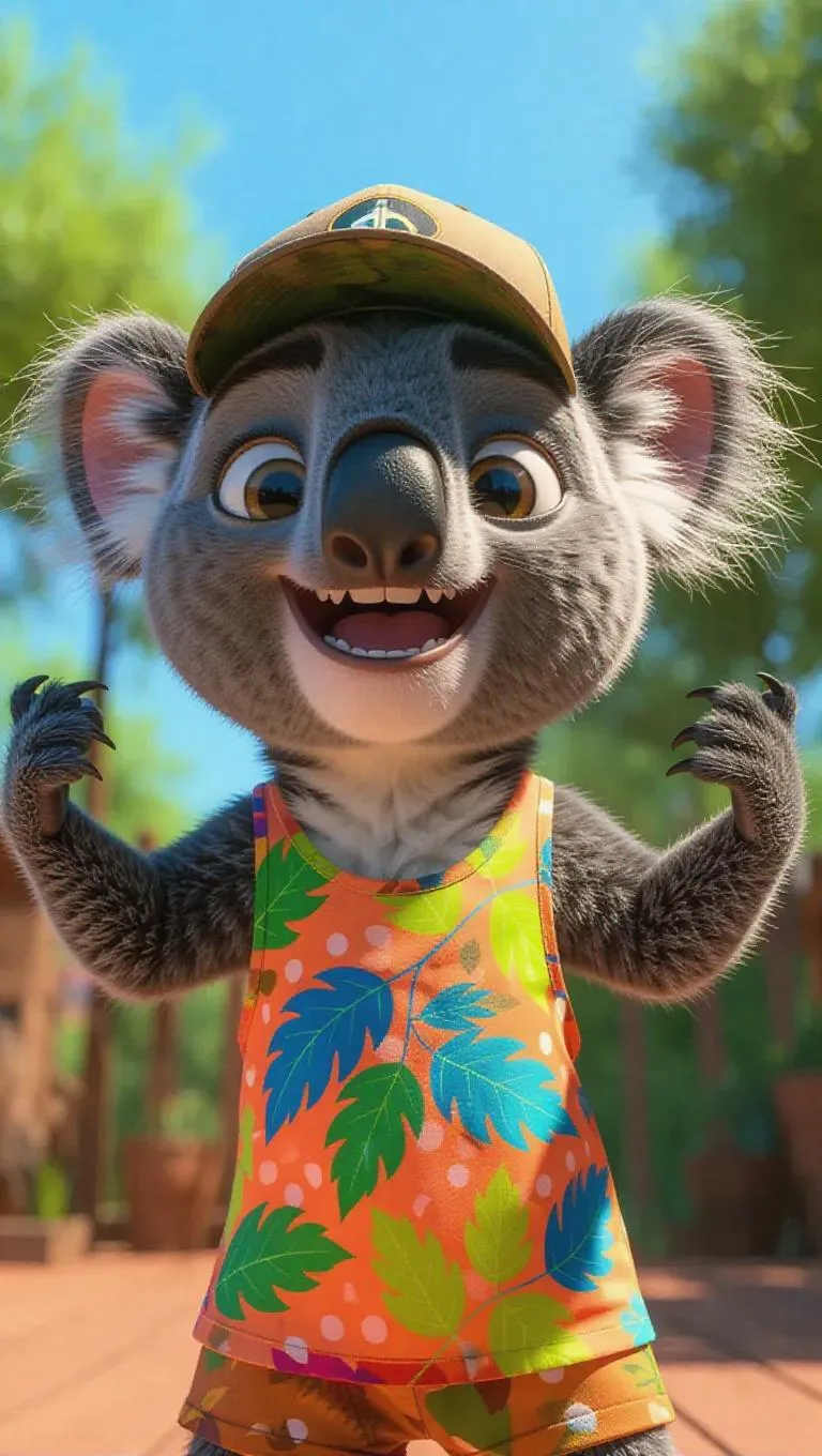 A cheerful T 台 scene featuring a joyful koala strutting boldly in a vibrant tank top with leaf motifs, wearing a baseball cap, creating a breezy and cheerful atmosphere.