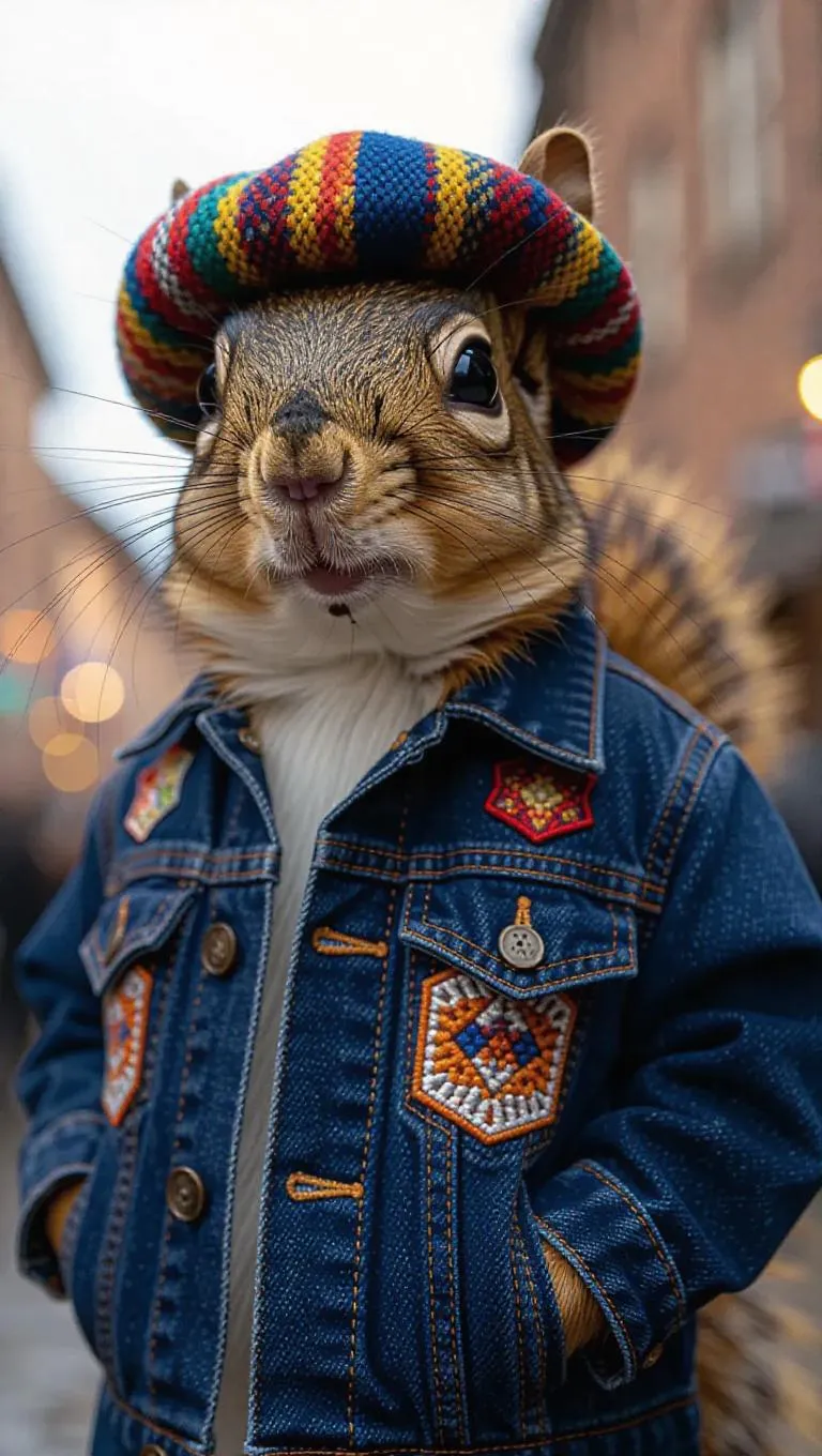 A cheerful T 台 scene featuring a spunky squirrel strutting boldly in a denim jacket with patchwork designs, wearing a stylish beret, creating an adventurous and playful atmosphere.