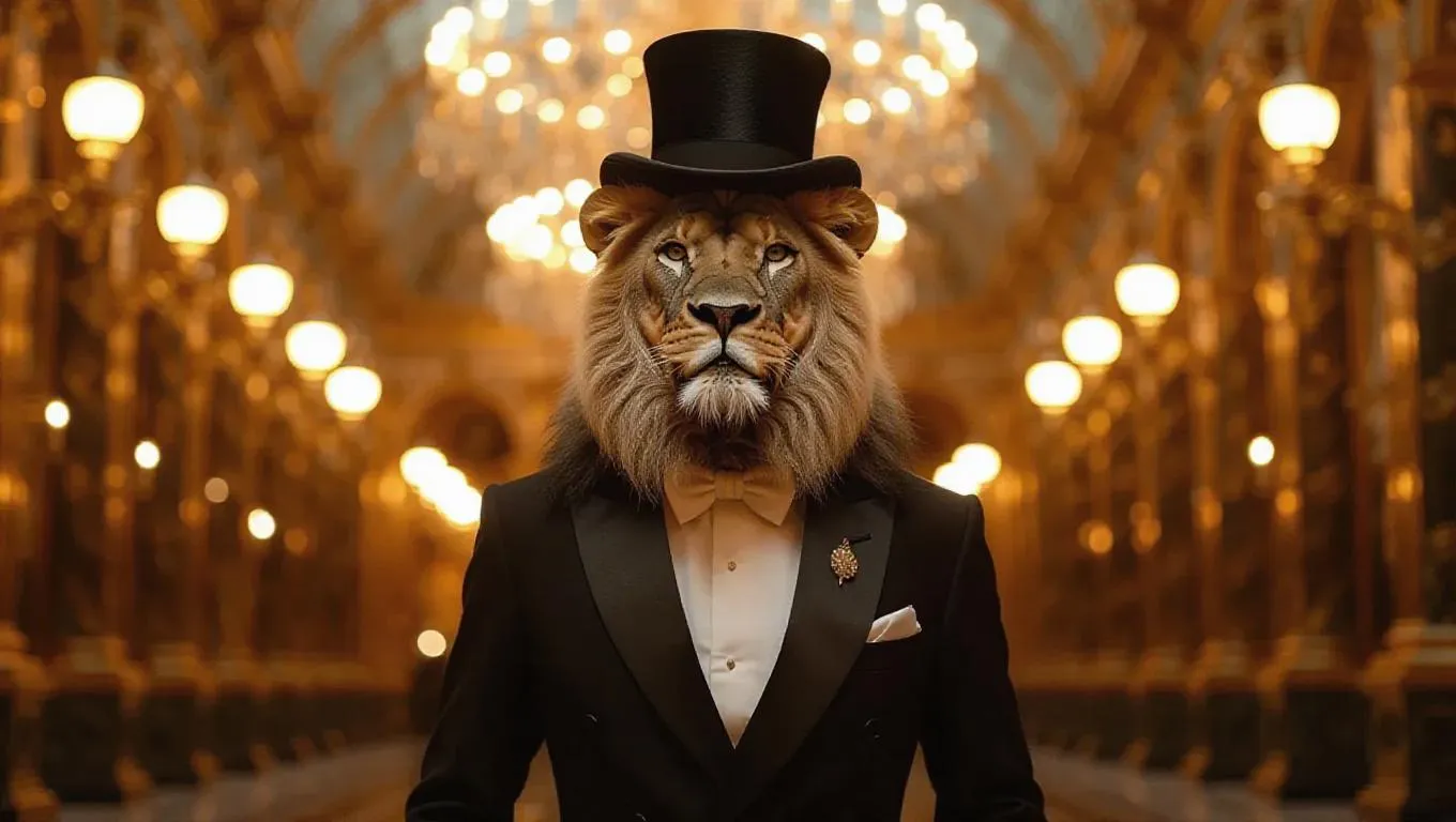 A cheerful T 台 scene featuring a majestic lion strutting boldly in a classic tuxedo, wearing a top hat, creating an elegant and dynamic atmosphere.