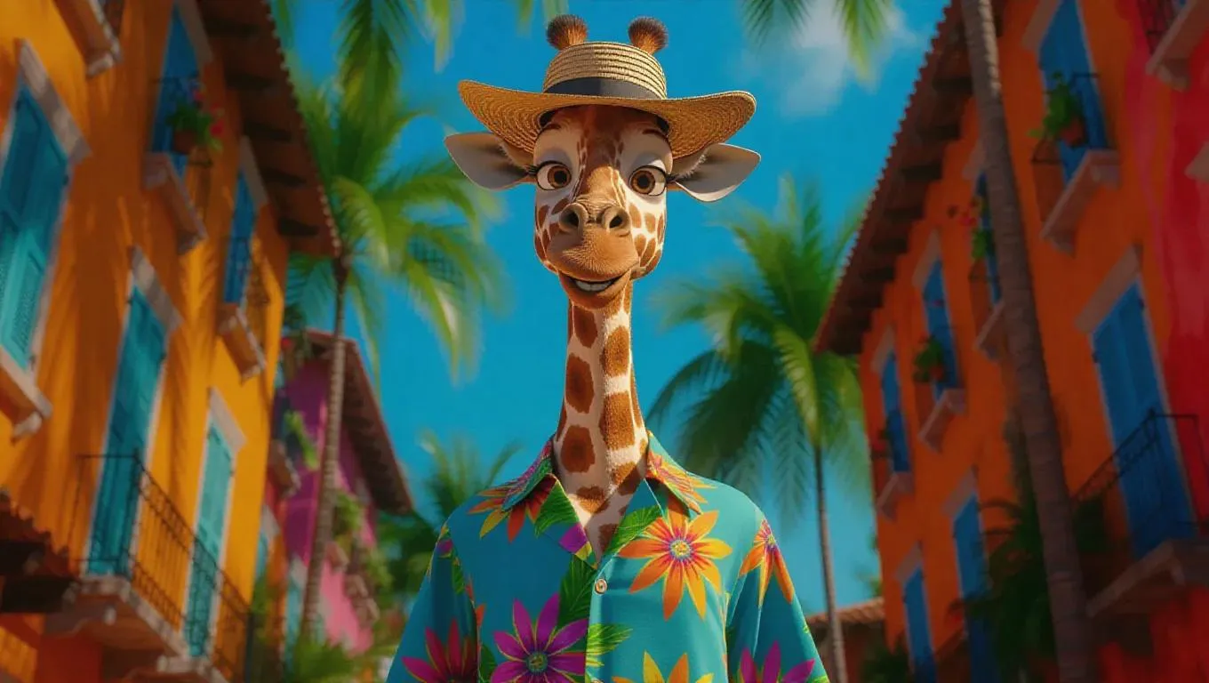 A cheerful T 台 scene featuring a cheerful giraffe strutting boldly in a vibrant shirt with jungle prints, wearing a straw boater hat, creating a lively and immersive atmosphere.