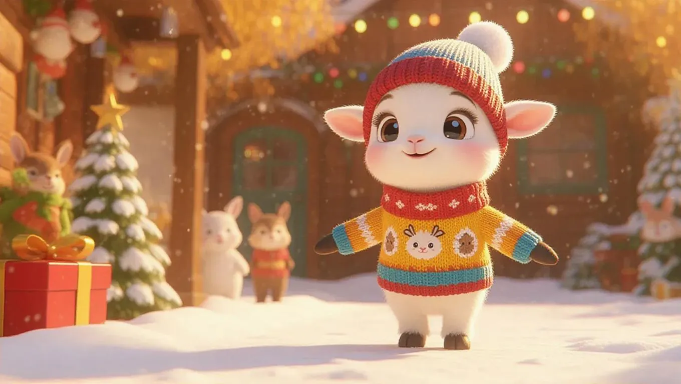 A cheerful T 台 scene featuring a charming little goat strutting boldly in a bright sweater with cartoon animals, wearing a beanie with pom-poms, creating a lively and joyful atmosphere.