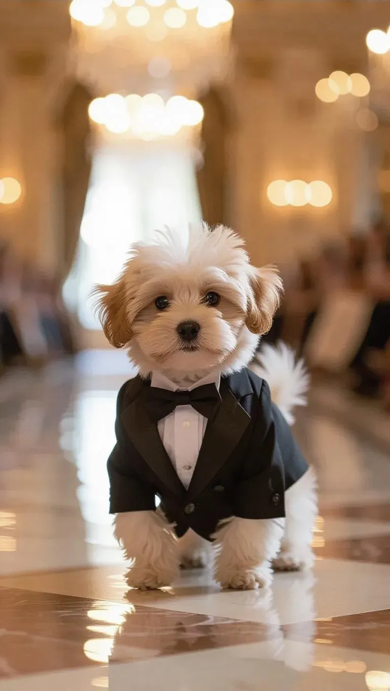 The fluffy puppy, in a tiny tuxedo with a bowtie, waddles down the runway with an elegant poise. The camera catches its charming steps, showcasing the tuxedo's crisp lines and the puppy's fluffy tail. The background is a classy, ornate ballroom, highlighting the puppy's sophisticated charm.
