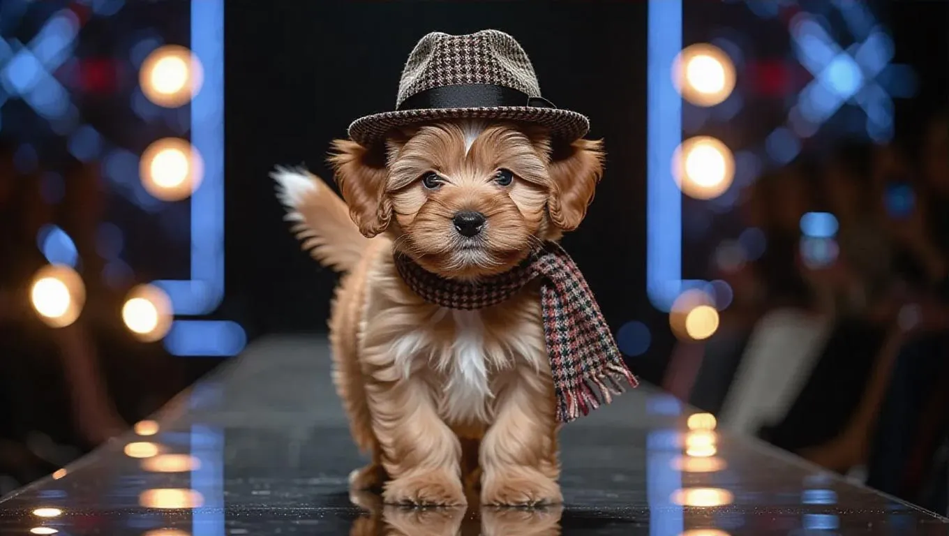 The fluffy puppy, sporting a vintage hat and matching scarf, ambles down the runway with a charming look. The camera zooms in on the nostalgic accessories and the puppy's happy tail. The background features a retro-themed setting, highlighting the puppy's delightful character.
