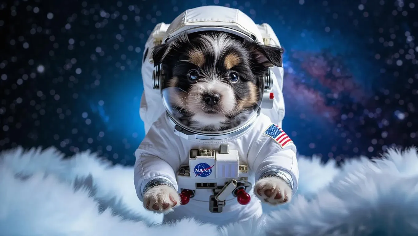 The fluffy puppy, dressed in an astronaut suit with a helmet, floats down the runway with a curious gaze. The camera captures its unique presence, emphasizing the space suit and the puppy's wide eyes. The background is a starry outer space scene, enhancing the puppy's out-of-this-world charm.
