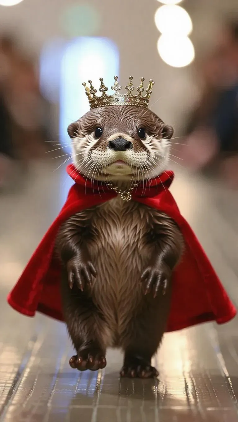 A baby otter waddles down the runway, its brown fur fluffy and adorable. It wears a tiny cape and a crown, giving it a royal yet sweet look. The otter's playful bounds and curious twirls are utterly charming.