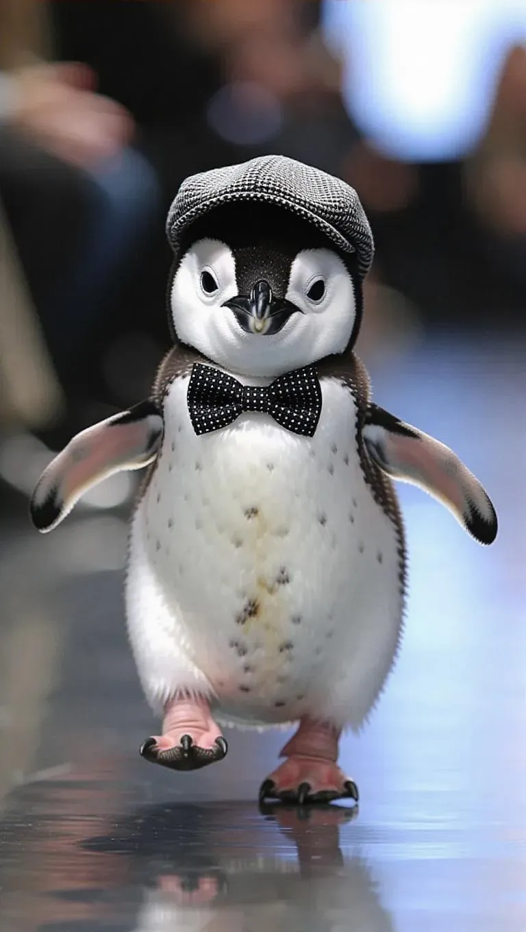 A baby penguin waddles down the runway, its glistening black-and-white feathers shimmering. It wears a tiny bow tie and a baseball cap, giving it a sporty yet cute look. The penguin's bouncy waddle and bright-eyed peeks are utterly charming.