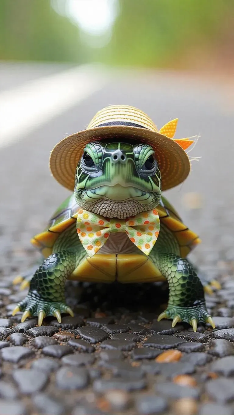 A baby turtle crawls down the runway, its shell a vibrant green. It wears a tiny bow tie and a sun hat, giving it a cheerful yet cute look. The turtle's slow movements and curious peeks are utterly charming.
