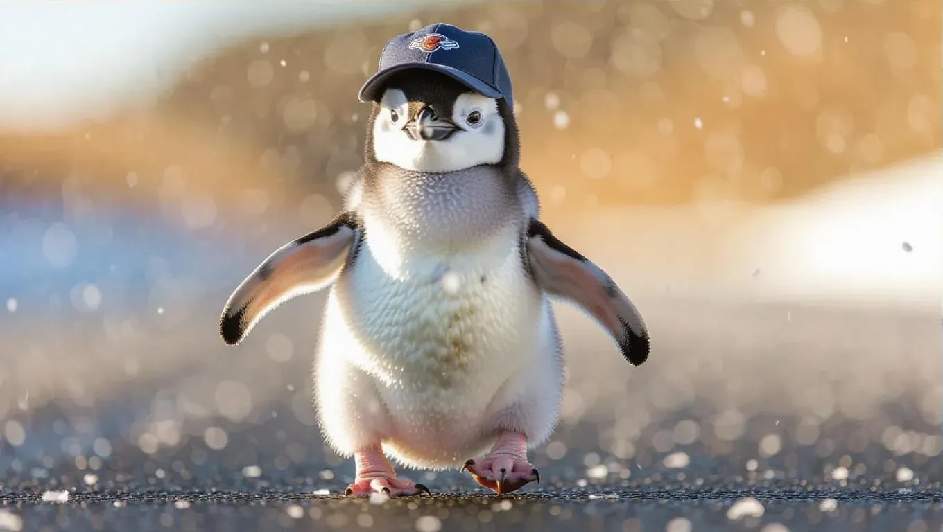 A baby penguin waddles down the runway, its feathers glossy and vibrant. It wears a tiny shirt and a baseball cap, giving it a sporty yet charming look. The penguin's excited waddles and playful peeks are utterly charming.
