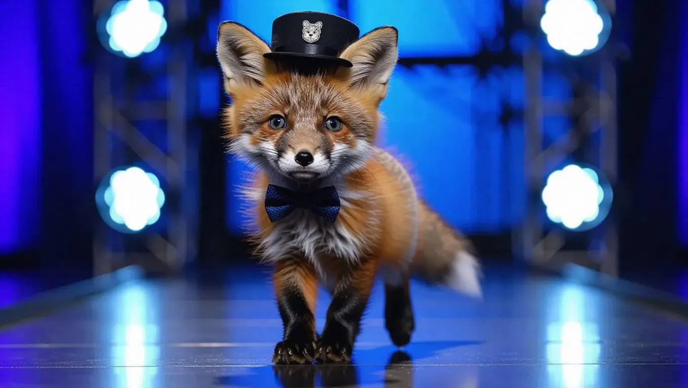 A baby fox trots down the runway, its orange fur glossy and bright. It wears a tiny bow tie and a detective's hat, giving it a curious yet adorable look. The fox's lively prances and inquisitive expressions are utterly charming.