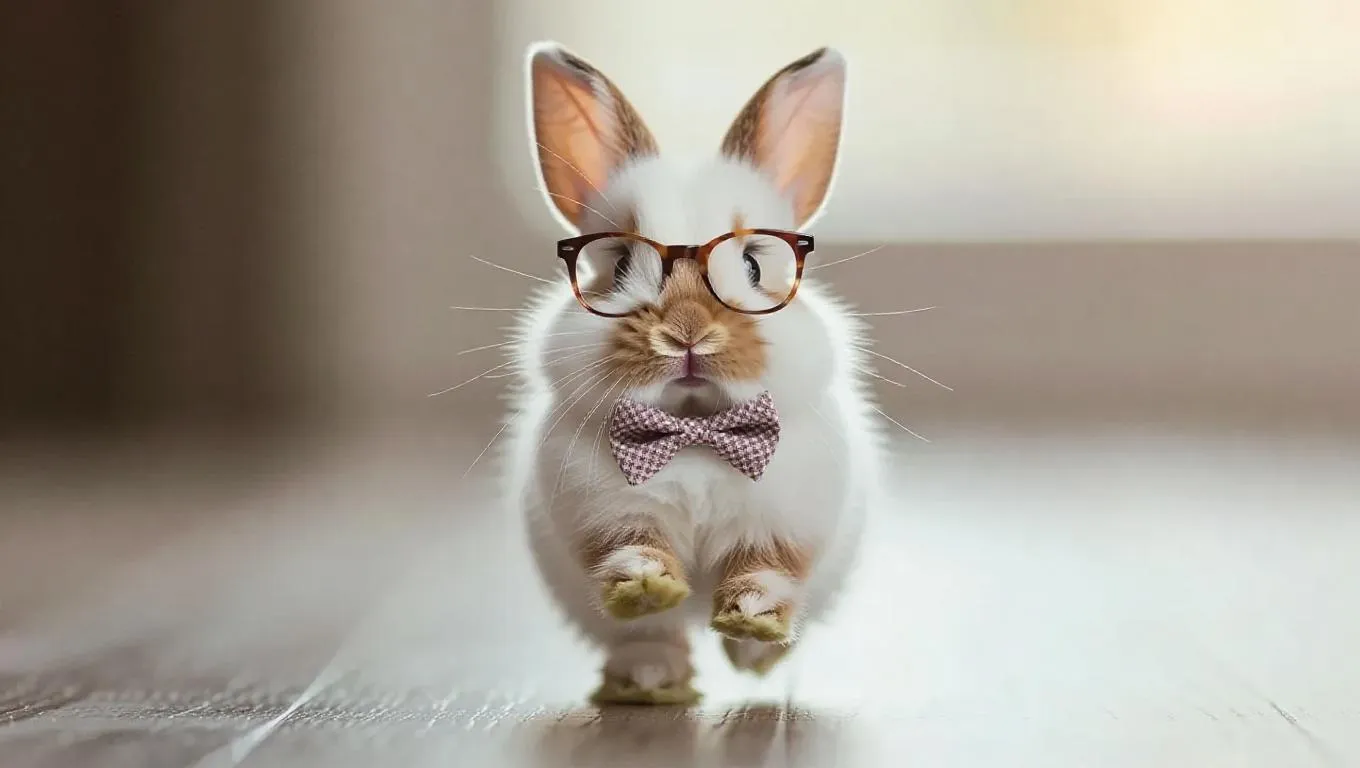 A baby rabbit hops down the runway, its soft fur fluffy and white. It wears a tiny bow tie and glasses, giving it a nerdy yet adorable look. The rabbit's energetic hops and curious twitches are utterly charming.