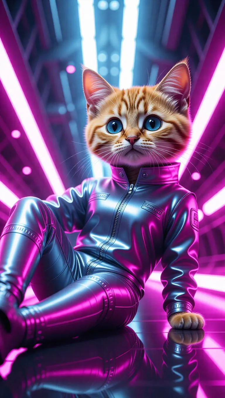 Full body, tiny cute little orange tabby cat with blue eyes, delicate eyelashes, blush on the cheeks, charming, cartoon, photorealism, lounging elegantly on a futuristic runway, dressed in a shiny silver jumpsuit with glowing pink accents, wearing sleek grey boots, striking a relaxed pose with one paw stretched out, surrounded by abstract light trails.