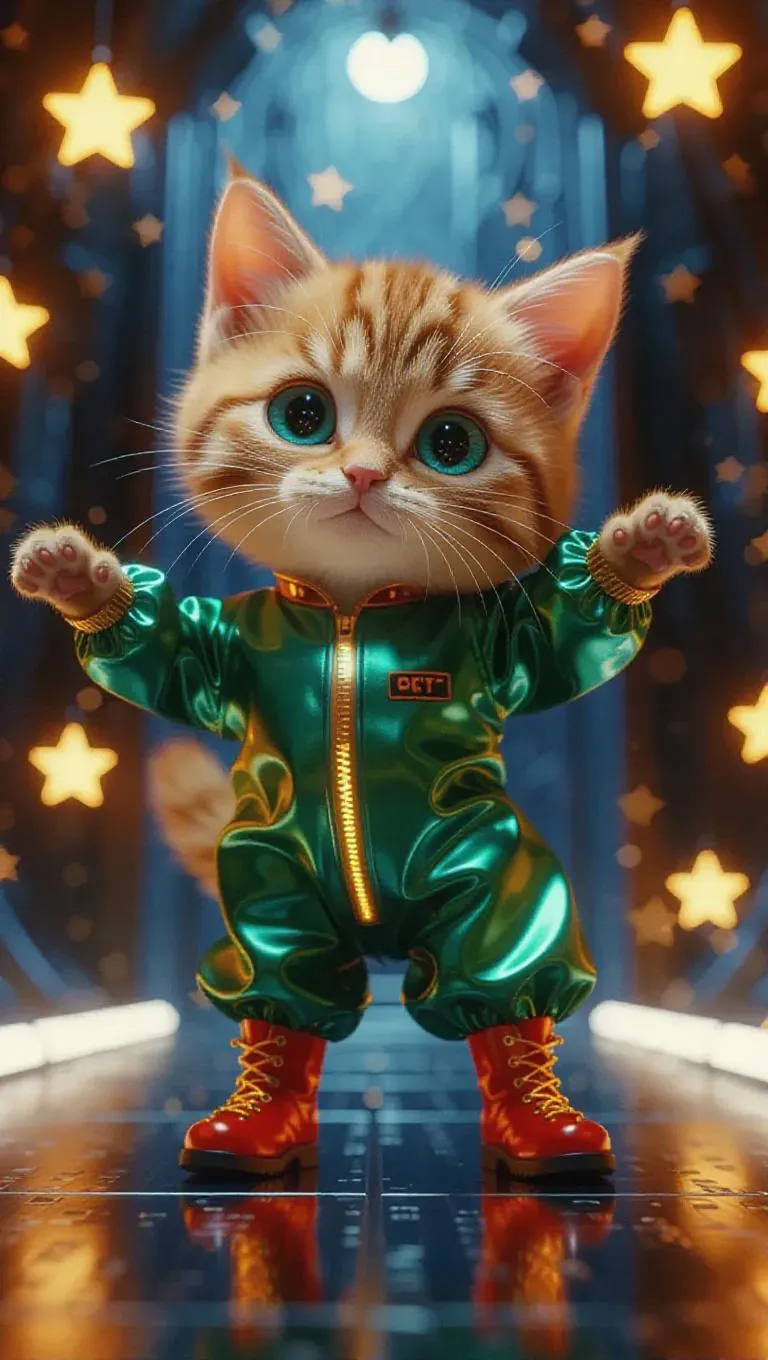 Full body, tiny cute little orange tabby cat with azure eyes, delicate eyelashes, blush on the cheeks, lovely, cartoon, photorealism, dancing joyfully on a futuristic runway, dressed in a metallic emerald jumpsuit with glowing yellow accents, wearing bold red boots, striking a dynamic pose, surrounded by animated stars.
