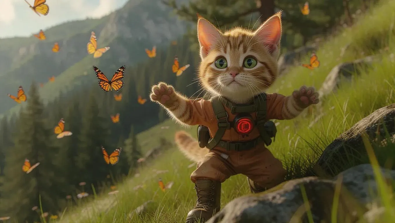 Full body, tiny cute little orange tabby cat with earthy green eyes, delicate eyelashes, blush on the cheeks, adorable, cartoon, photorealism, exploring energetically on a grassy hilltop, dressed in a rugged jumpsuit with glowing red accents, wearing sturdy hiking boots, striking an adventurous pose, surrounded by floating trails of butterflies.