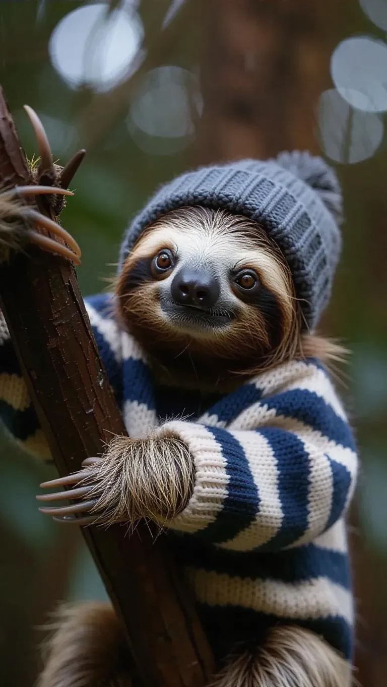 A baby sloth carefully descends from a branch, using its long claws for grip. It is adorned in a striped sweater and a beanie, adding to its charming aura. The sloth's droopy eyes and placid nature are heartening.