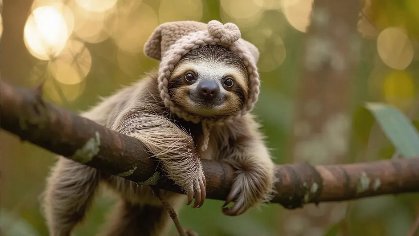 A baby sloth makes its way along a thick branch, moving slowly. It sports a cozy fleece jacket and a cute headband, giving it an endearing look. The sloth's soft gaze and relaxed demeanor are heartwarming.
