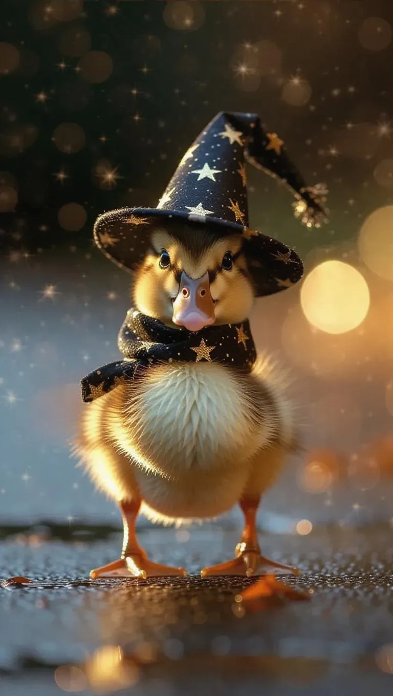 A baby duckling waddles down the runway, its soft white feathers glowing warmly. It wears a tiny wizard hat and a starry scarf, giving it a magical theme. The duckling's quacks and wobbly steps are irresistibly cute.