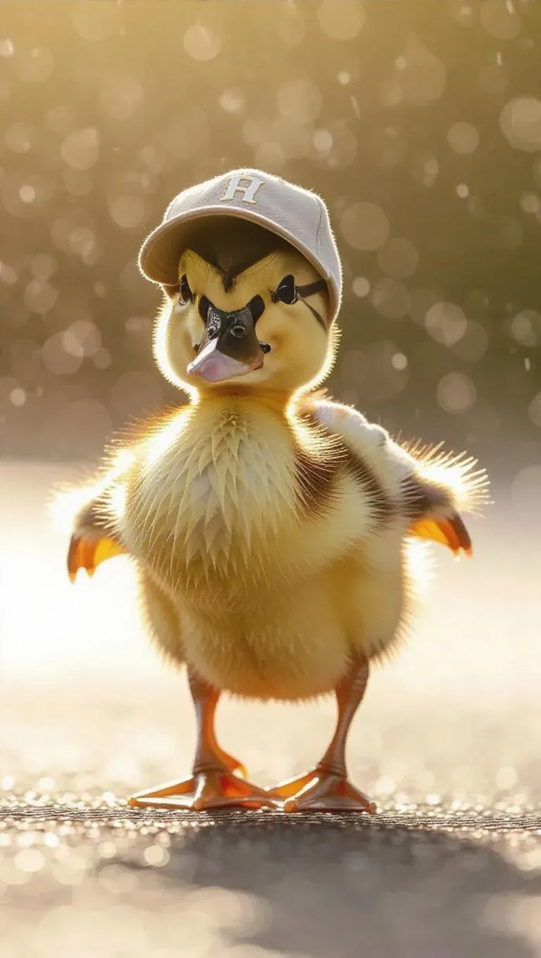 A baby duckling waddles down the runway, its soft yellow feathers glowing in the sunlight. It wears a tiny baseball cap and a jersey, giving it a sports theme. The duckling's quacks and wobbly steps are irresistibly cute.