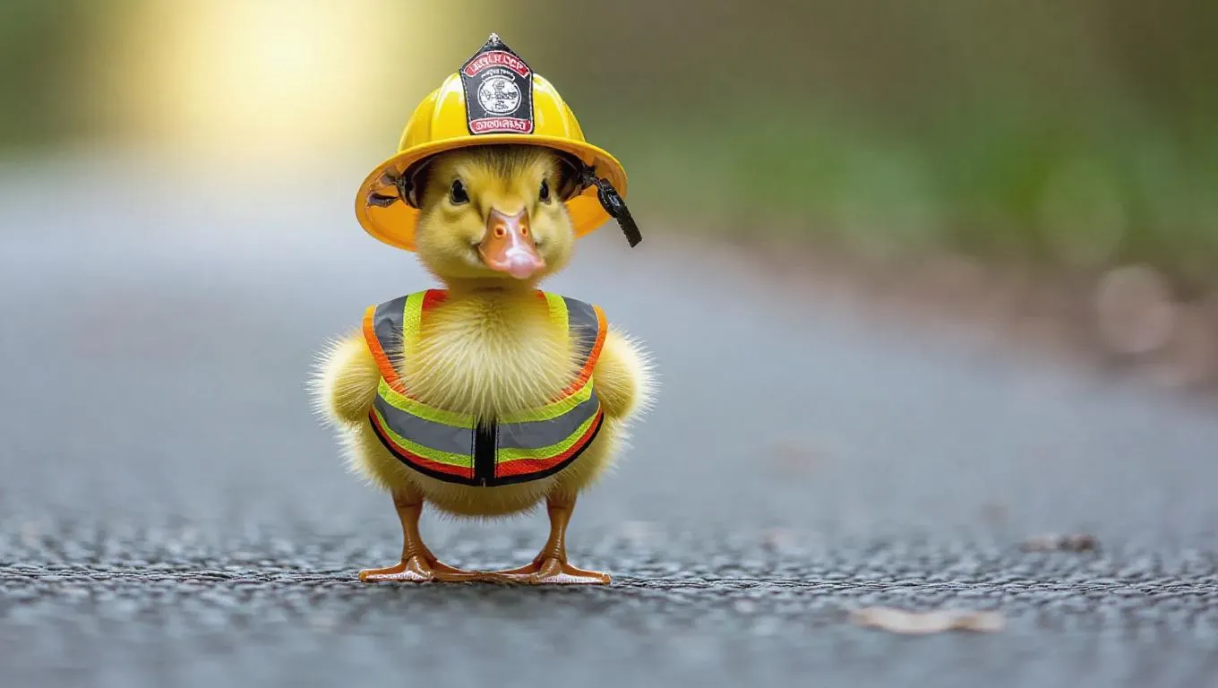 A baby duckling waddles down the runway, its soft yellow feathers glowing brightly. It wears a tiny firefighter helmet and a reflective vest, giving it a heroic theme. The duckling's quacks and wobbly steps are irresistibly cute.
