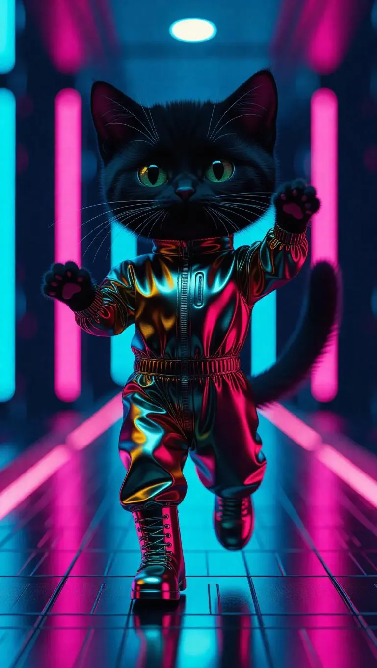 Full body, tiny cute little black tabby cat with green eyes, delicate eyelashes, blush on the cheeks, cute, cartoon, photorealism, walking elegantly on a futuristic runway, dressed in a metallic gold jumpsuit with glowing red accents, wearing sleek silver boots, striking a pose with both paws raised, surrounded by neon lights.