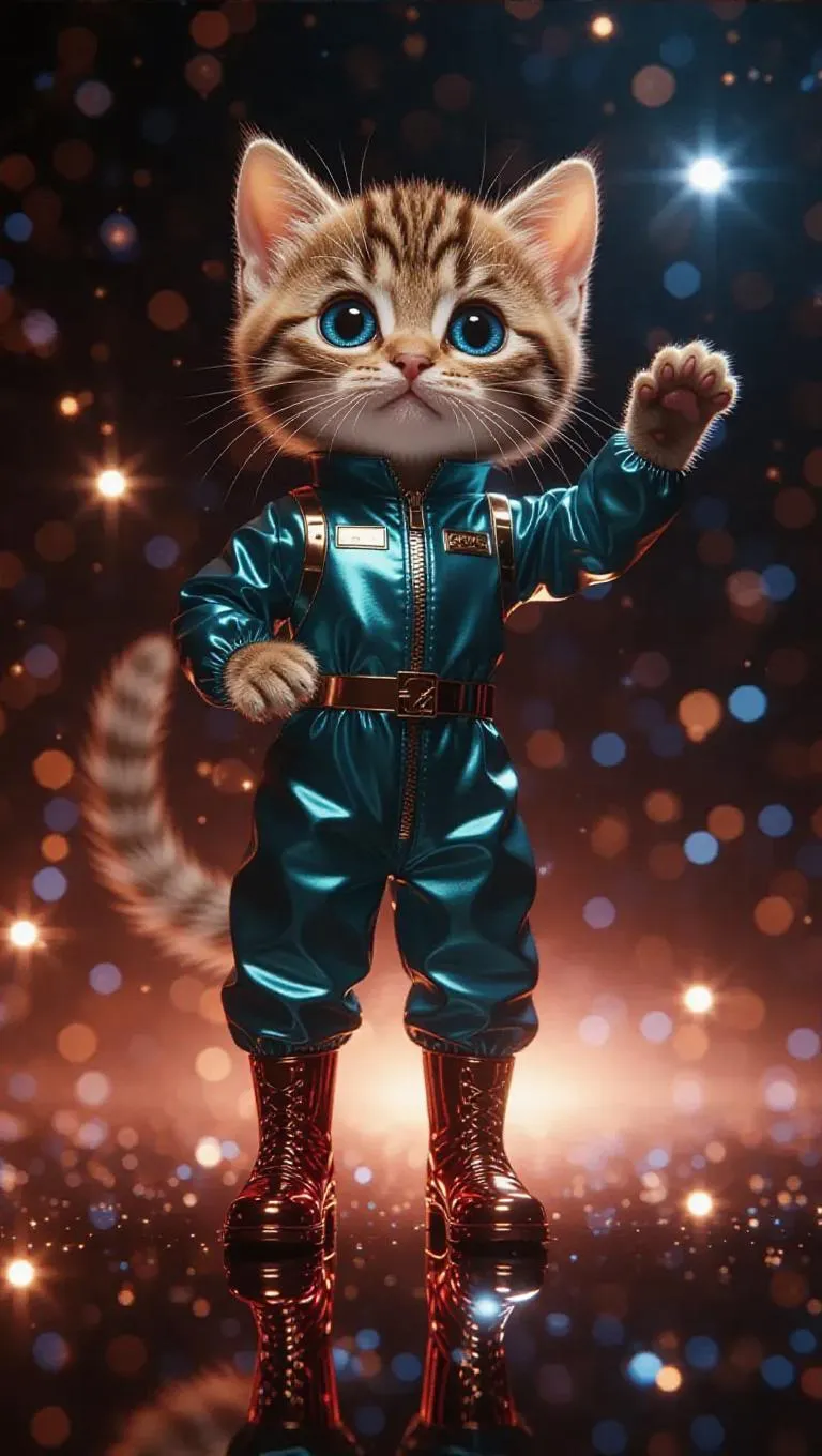 Full body, tiny cute little brown tabby cat with blue eyes, delicate eyelashes, blush on the cheeks, cute, cartoon, photorealism, prancing elegantly on a cosmic runway, dressed in a metallic teal jumpsuit with glowing white accents, wearing sleek red boots, posing with one paw lifted, surrounded by starry constellations.