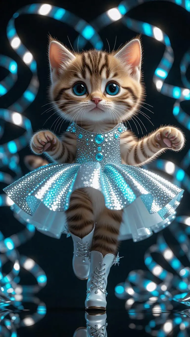 Full body, tiny cute little tabby cat with bright blue eyes, delicate eyelashes, blush on the cheeks, cute, cartoon, photorealism, trotting proudly on an elegant runway, dressed in a shimmering silver dress with glowing turquoise accents, wearing fabulous white boots, striking a dynamic pose, surrounded by swirling ribbons.