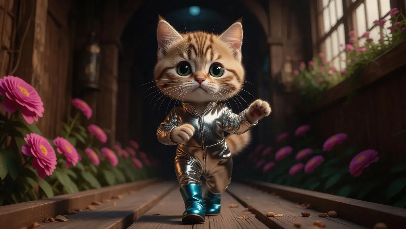 Full body, tiny cute little orange tabby cat with emerald eyes, delicate eyelashes, blush on the cheeks, cute, cartoon, photorealism, walking adorably on a rustic runway, dressed in a metallic silver jumpsuit with glowing gold accents, wearing fashionable deep blue boots, posing with an elegant twirl, surrounded by floral patterns.