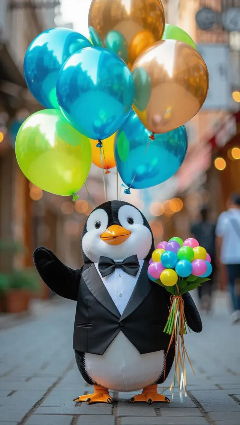 A cheerful T 台 scene featuring a cute penguin strutting confidently in a tuxedo with a bow tie, holding a bouquet of colorful balloons in indigo, lime, and bronze, floating playfully above him, creating a whimsical and vibrant atmosphere.