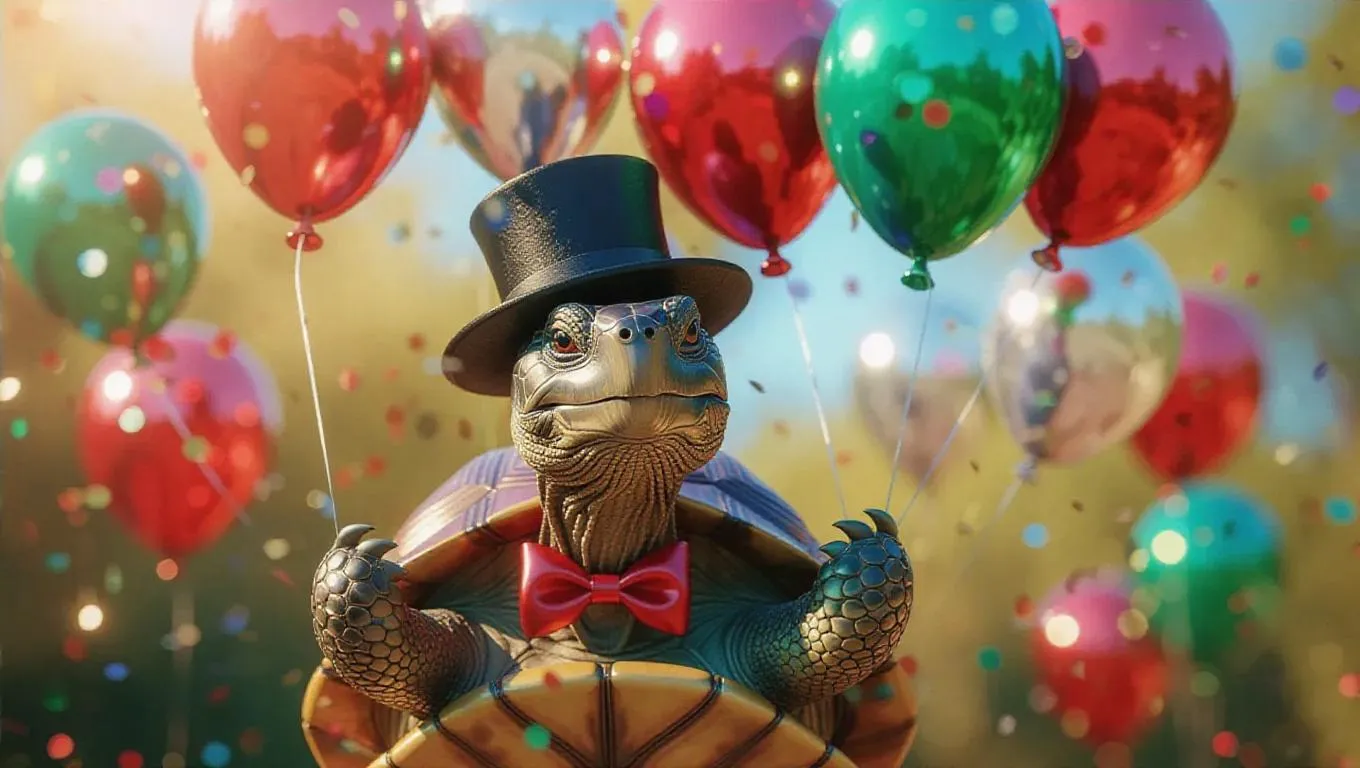 A cheerful T 台 scene featuring a charming tortoise strutting confidently in a bowler hat with a bow tie, holding a bouquet of colorful balloons in crimson, emerald, and silver, floating playfully around her, creating a whimsical and vibrant atmosphere.
