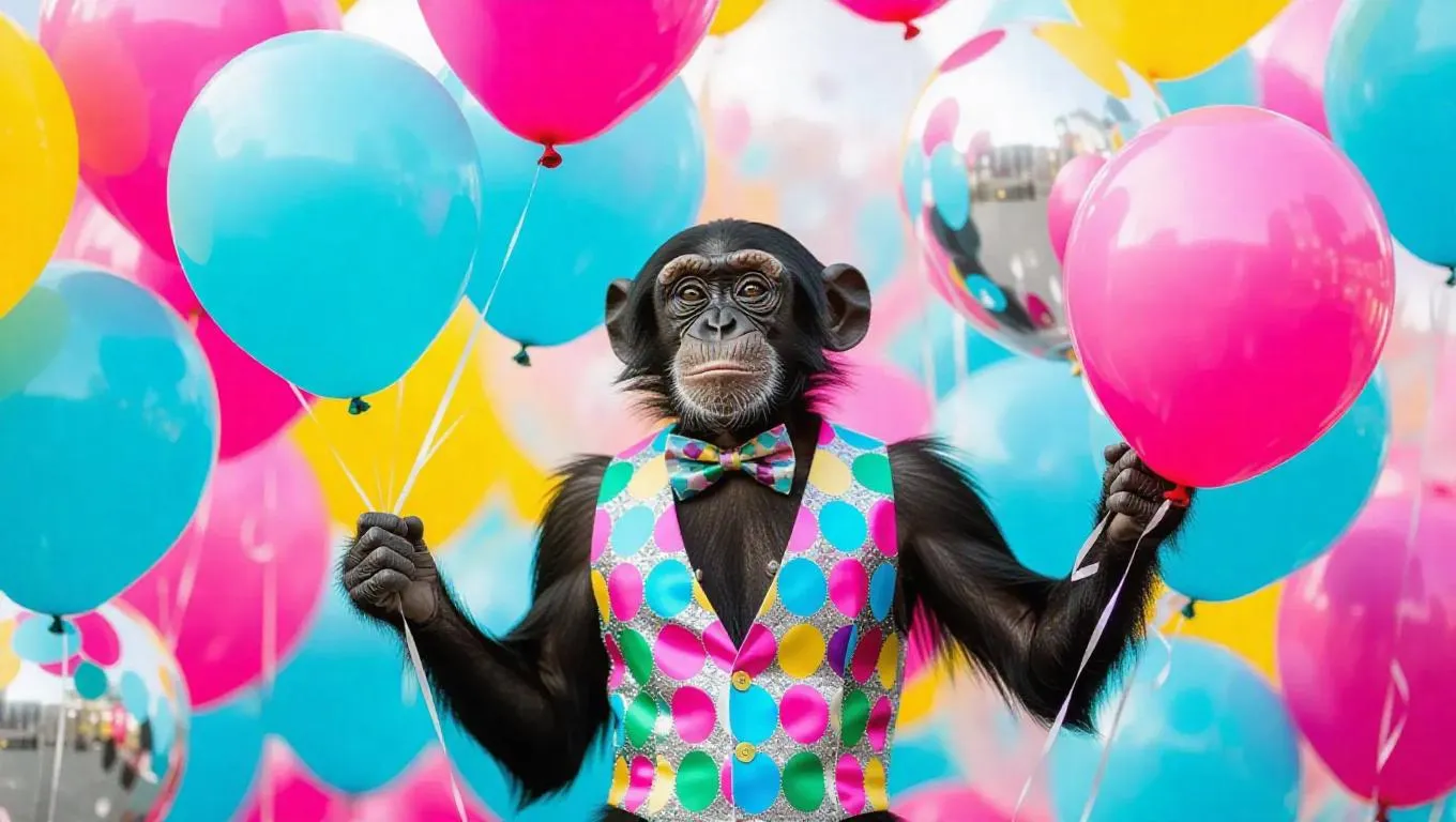 A cheerful T 台 scene featuring a stylish monkey strutting confidently in a colorful vest with a bow tie, holding a bouquet of colorful balloons in aqua, ruby, and silver, floating playfully around her, creating a whimsical and vibrant atmosphere.