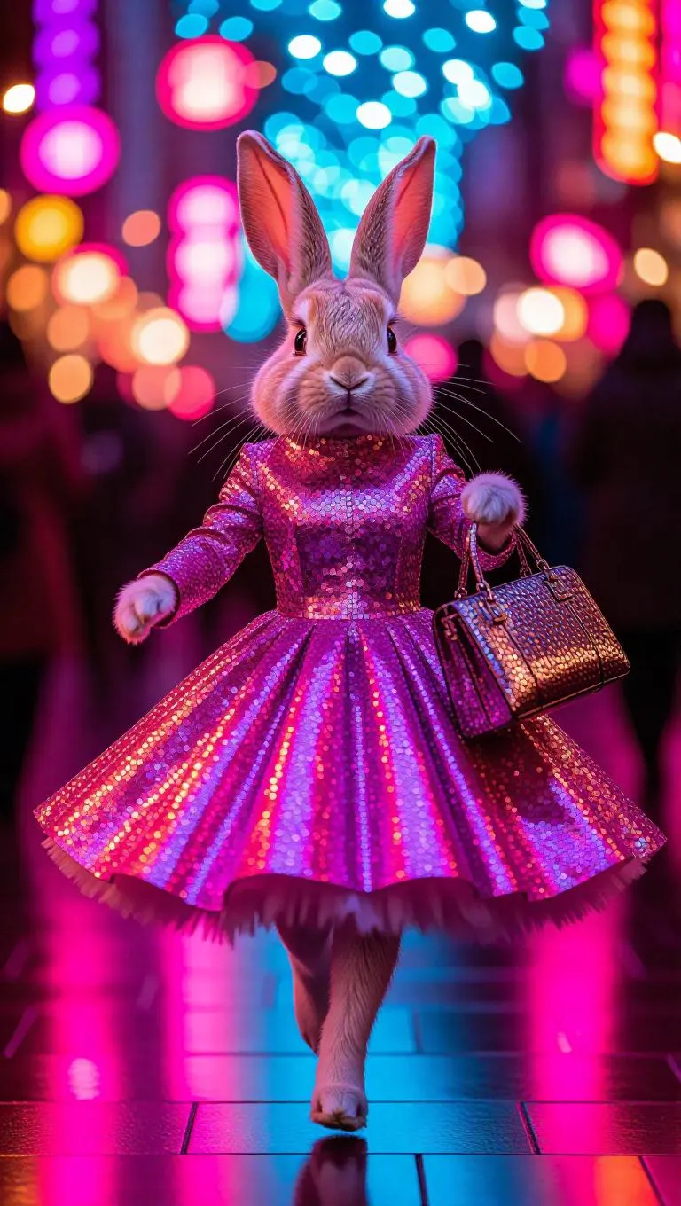A vibrant T 台 scene featuring a playful rabbit gliding gracefully in a shimmering sequin dress, holding a modern handbag, creating a whimsical and festive atmosphere.
