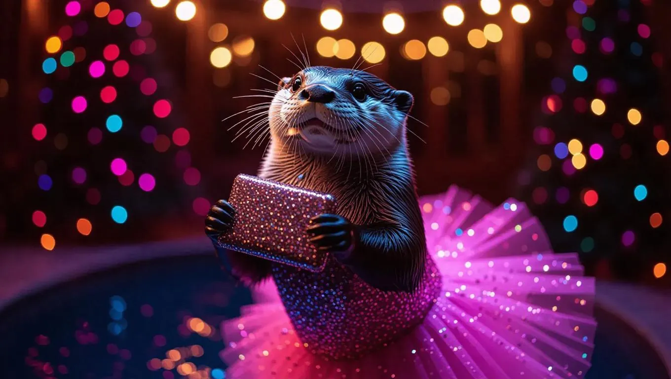 A festive T 台 scene featuring a joyful otter gliding gracefully in a sparkling party dress, holding a festive clutch, creating a celebratory and exciting atmosphere.