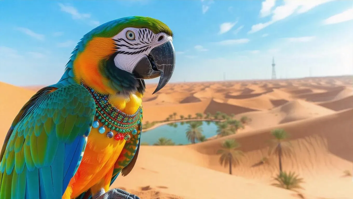 A vibrant parrot flutters at the edge of the Sahara Desert, Morocco, its feathers bright and eye-catching. The parrot wears a decorative necklace and a small cape that billows in the breeze. Behind it, endless sand dunes stretch out, their surfaces shimmering under the midday sun. In the distance, a small oasis glimmers invitingly, providing a sense of relief from the desert heat. The sky is a brilliant azure, adding to the lively scene.