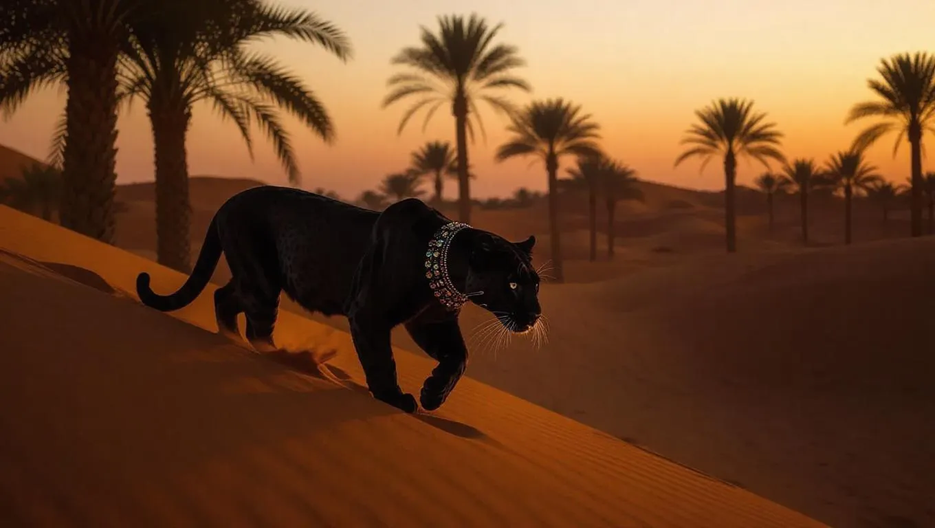 A sleek panther slinks along the edge of the Sahara Desert, Morocco, its fur casting shadows as it moves. The panther dons a striking collar and a light cape adorned with jewels. Behind it, endless sand dunes rise sharply, their surfaces glowing softly in the evening sun. In the distance, a cluster of palm trees provides shade, their shapes fuzzy against the orange sky. The atmosphere is filled with anticipation as dusk approaches.