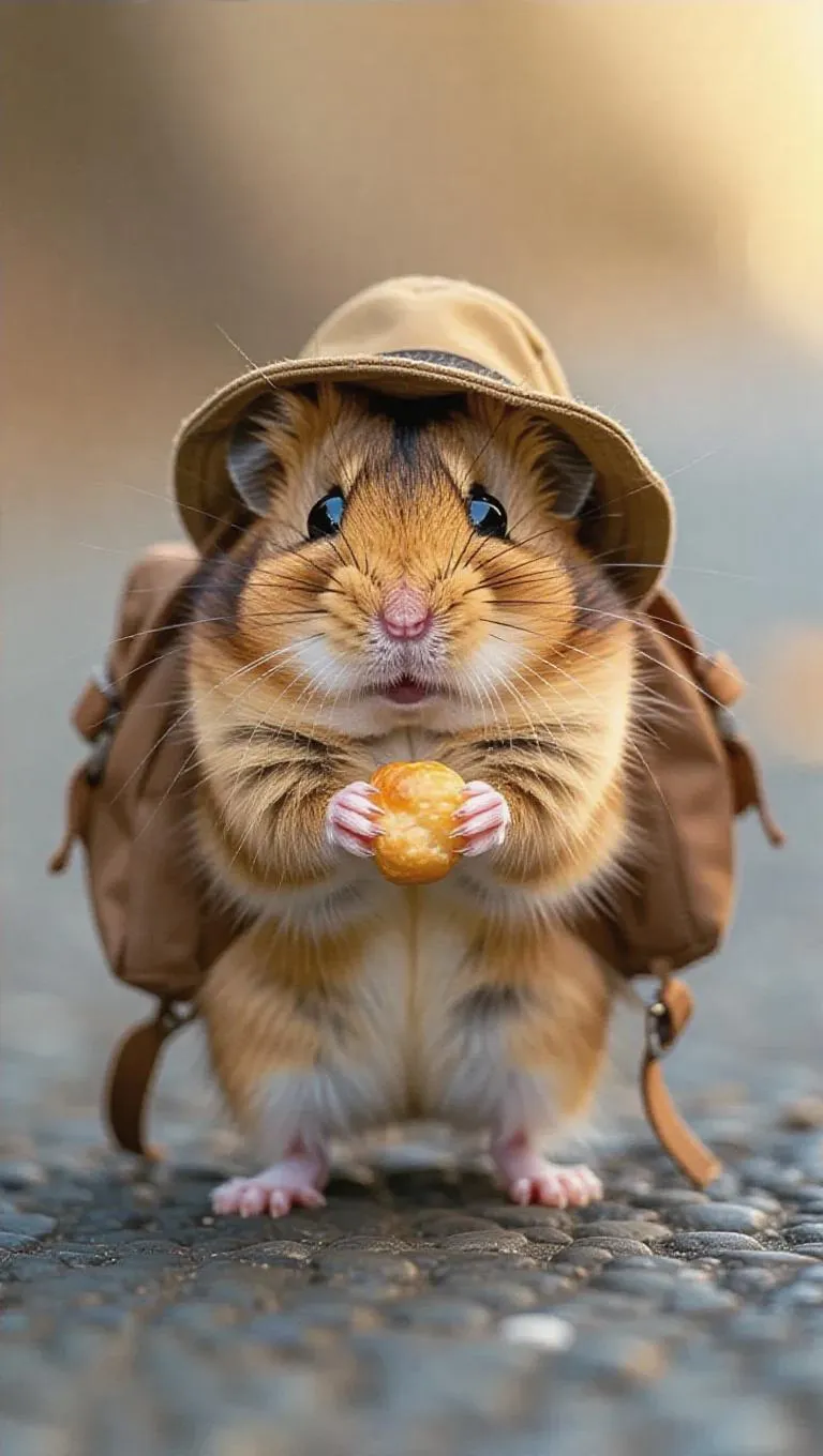 A tiny hamster scurries down the runway, its cheeks stuffed with a pretend snack. It wears a miniature backpack and a tiny explorer hat, creating an adventurous look. The hamster's quick steps and adorable antics are a crowd-pleaser.