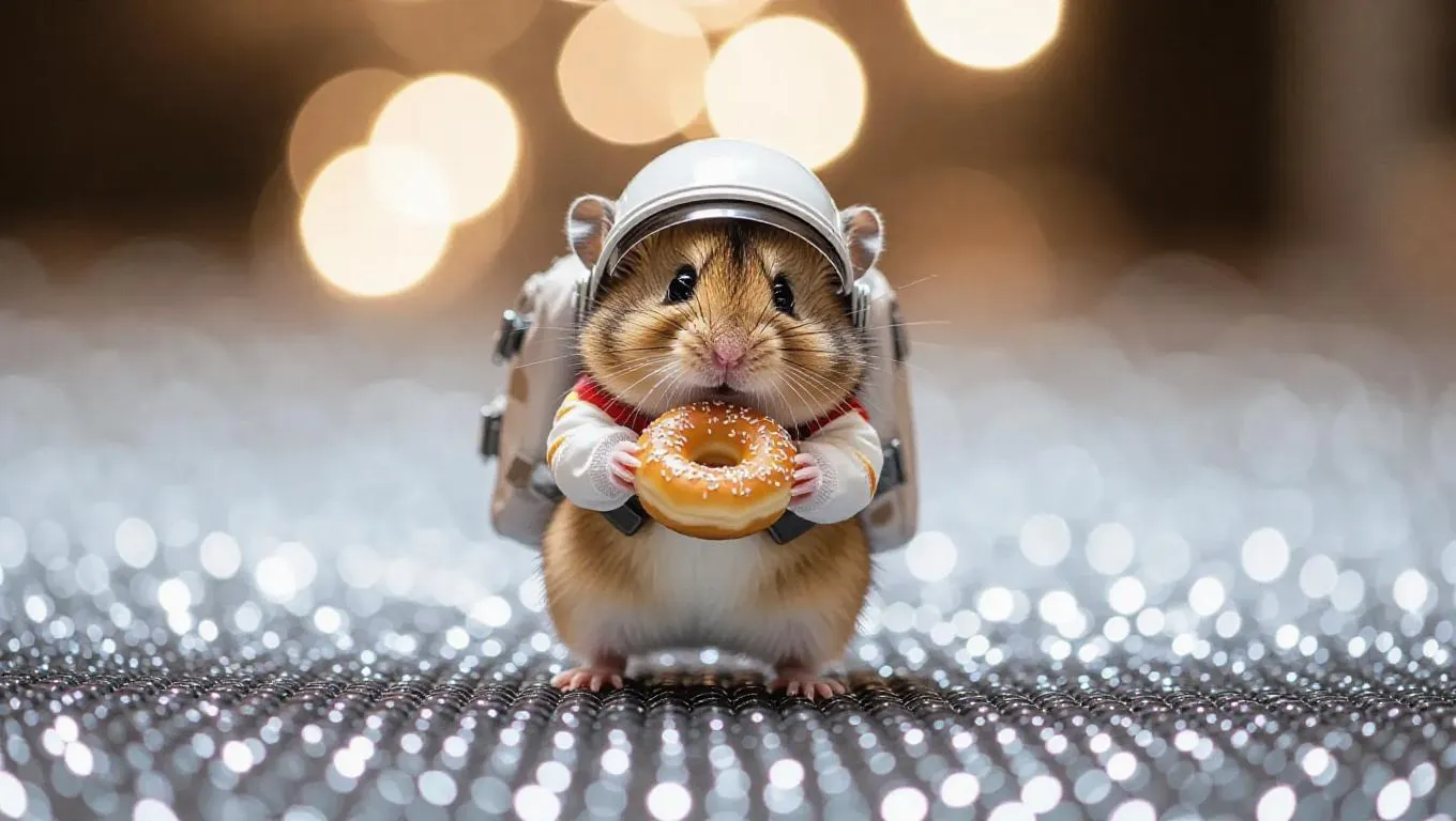 A tiny hamster scurries down the sparkling runway, its cheeks stuffed with a tiny donut. It wears a miniature backpack and a tiny astronaut suit, creating an adventurous look. The hamster's quick steps and cheeky antics are a crowd-pleaser.