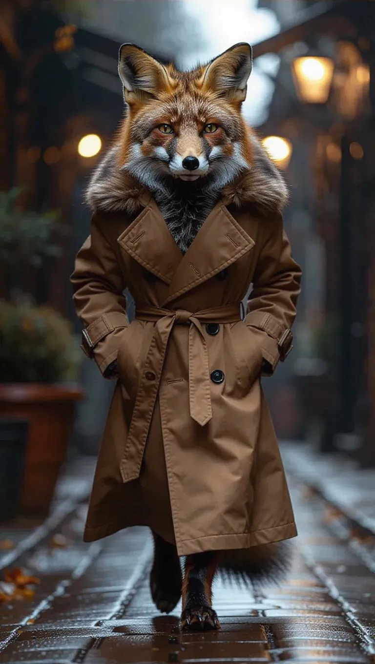The cunning fox, in a stylish trench coat lined with fur, slinks down the runway with a sly expression. The camera follows its stealthy walk, emphasizing the coat's luxury and the fox's clever look. The background is a shadowy alley runway, enhancing the fox's mysterious and clever nature.