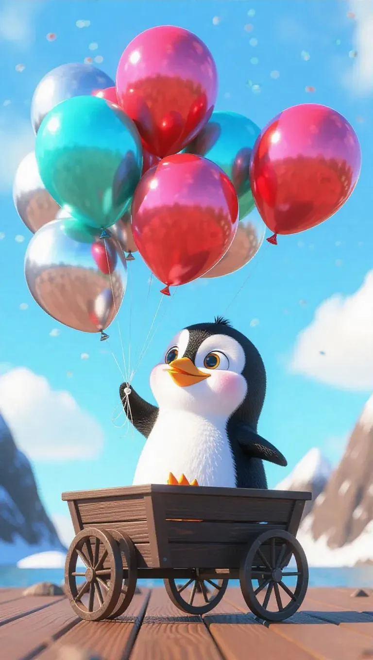 A cheerful cartoon scene featuring a cute penguin selling colorful balloons from his wagon, the balloons are crimson, teal, and silver, floating playfully above him, creating a whimsical and vibrant atmosphere.