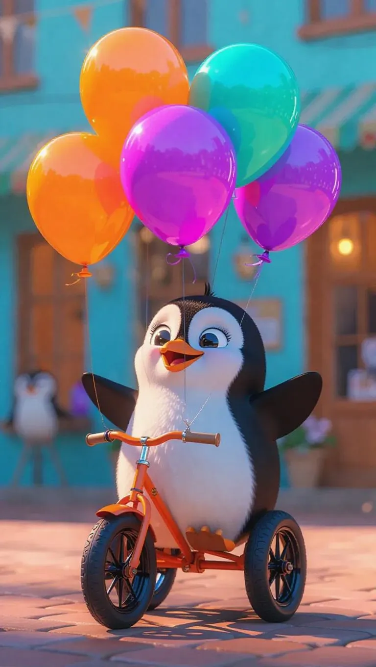 A cheerful cartoon scene featuring a cute penguin selling colorful balloons from his tricycle, the balloons are orange, violet, and emerald, floating playfully above him, creating a whimsical and vibrant atmosphere.