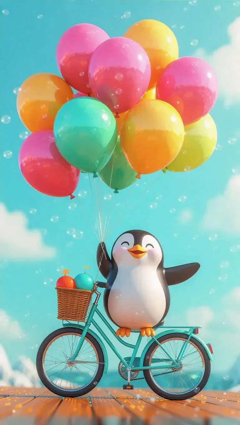 A cheerful cartoon scene featuring a cute penguin selling colorful balloons from his bicycle, the balloons are sea green, bright pink, and amber, floating playfully above him, creating a whimsical and vibrant atmosphere.