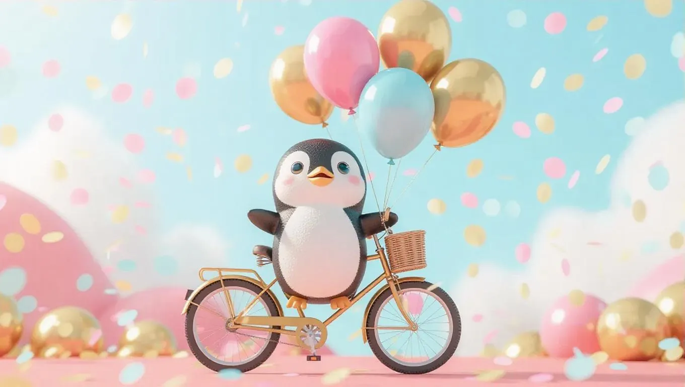 A cheerful cartoon scene featuring a cute penguin selling colorful balloons from his bicycle, the balloons are fuchsia, sky blue, and gold, floating playfully above him, creating a whimsical and soft atmosphere.