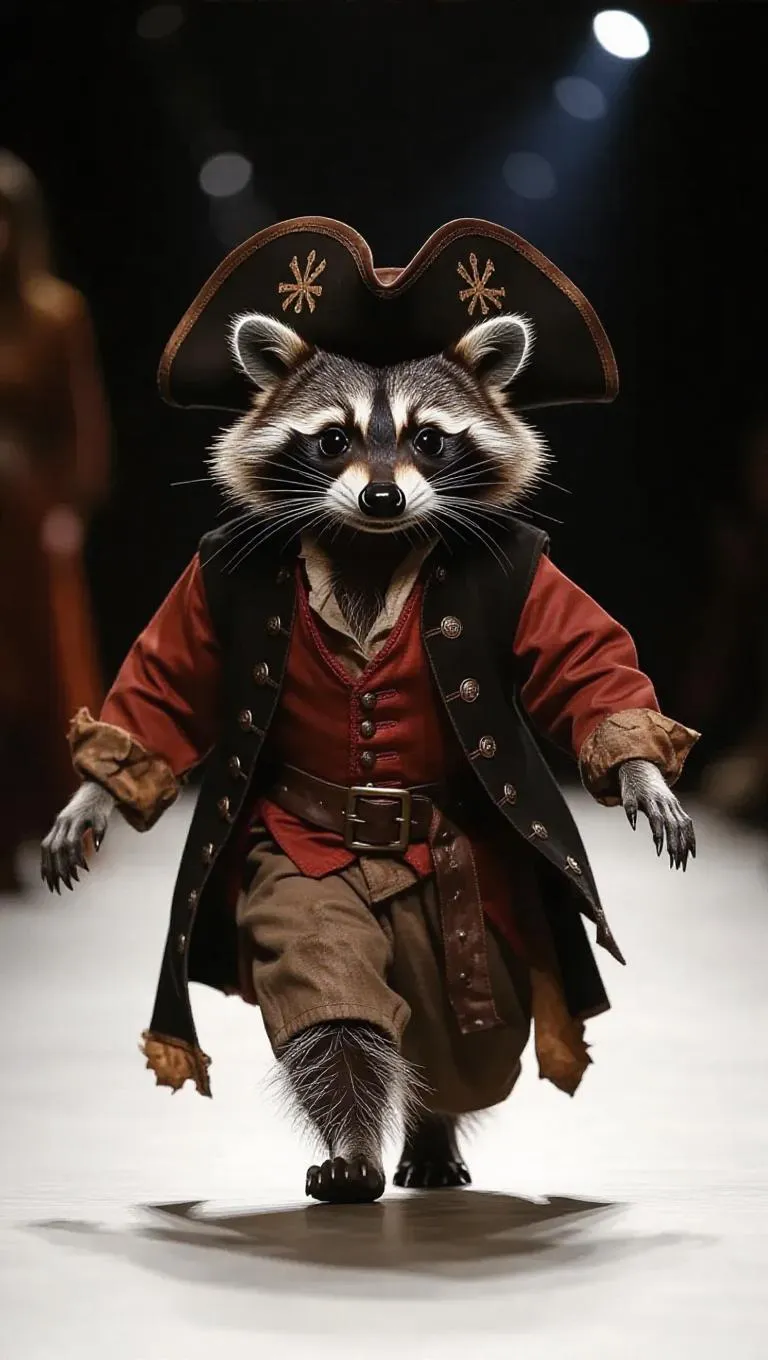 The curious raccoon, wearing a tattered old pirate costume, ambles down the runway with an inquisitive look. The camera follows its relaxed steps, capturing the movement of the costume and the raccoon's masked face. The background remains a sleek, minimalist runway, highlighting the raccoon's adventurous and mischievous spirit.