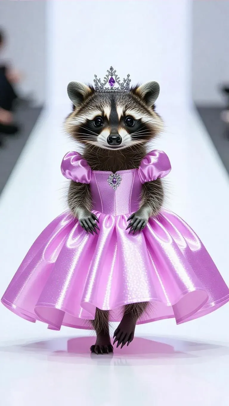 The curious raccoon, wearing a sparkly princess gown, ambles down the runway with an inquisitive look. The camera follows its relaxed steps, capturing the movement of the gown and the raccoon's masked face. The background remains a sleek, minimalist runway, highlighting the raccoon's whimsical and royal charm.