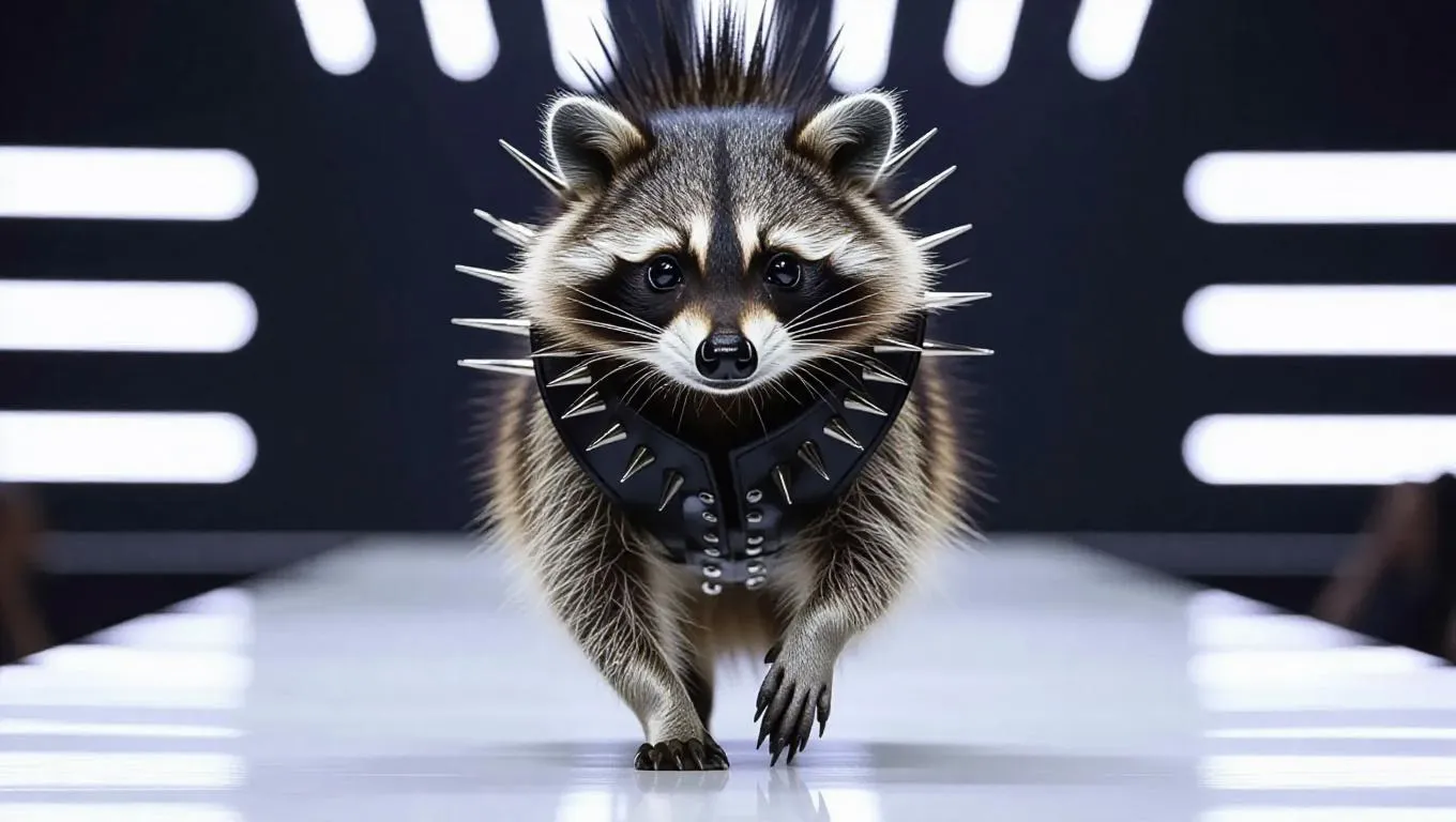The curious raccoon, wearing a punk rock outfit with spikes, ambles down the runway with an inquisitive look. The camera follows its relaxed steps, capturing the movement of the outfit and the raccoon's masked face. The background remains a sleek, minimalist runway, highlighting the raccoon's edgy and daring personality.