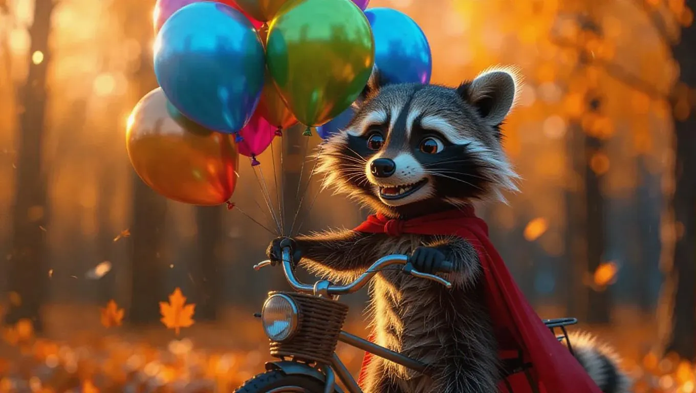 A cheerful cartoon scene featuring a cute raccoon wearing a cape selling colorful balloons from his bicycle, the balloons are indigo, lime, and bronze, floating playfully above him, creating a whimsical and vibrant atmosphere.