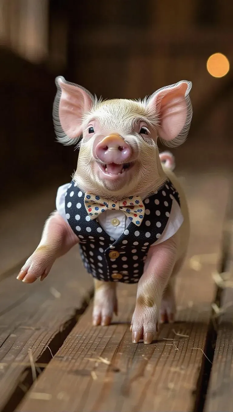 A tiny piglet parades down a wooden runway, its curly tail wagging with delight. It sports a dapper vest and a polka dot tie, giving it a charming and sophisticated look. The piglet's happy oinks and giggles resonate with the audience.
